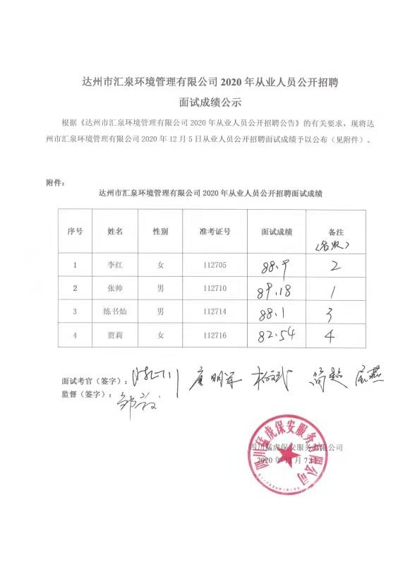 达州市汇泉情形管理有限公司2020年从业职员果然招聘加入笔试效果公示