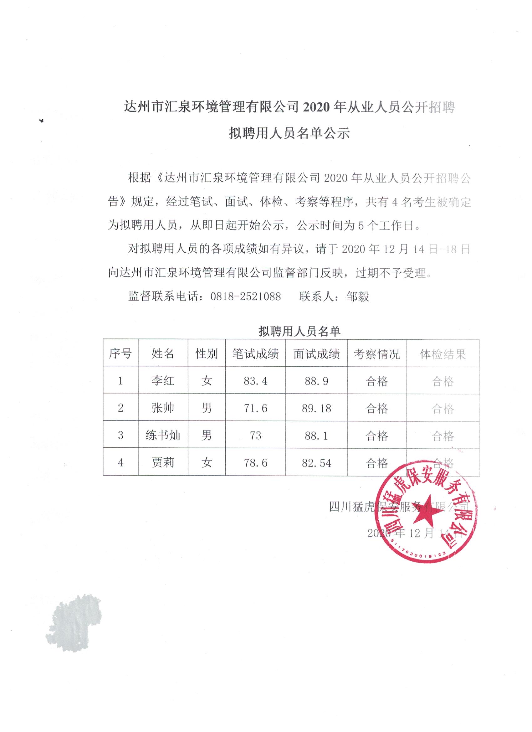 达州市汇泉情形管理有限公司2020年从业职员果然招聘笔试职员名单公示