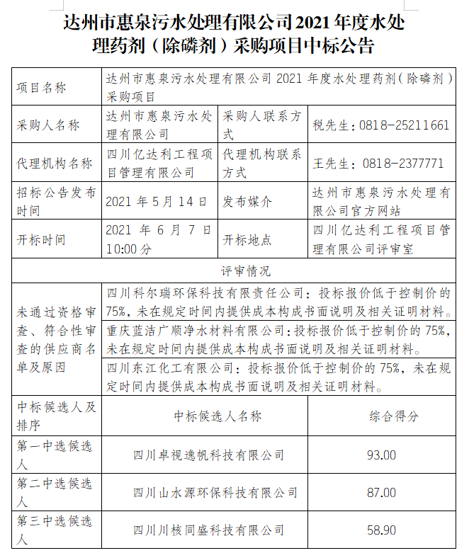 问题:达州市惠泉污水处置惩罚有限公司2021年度水处置惩罚药剂(除磷剂)采购项目中标通告